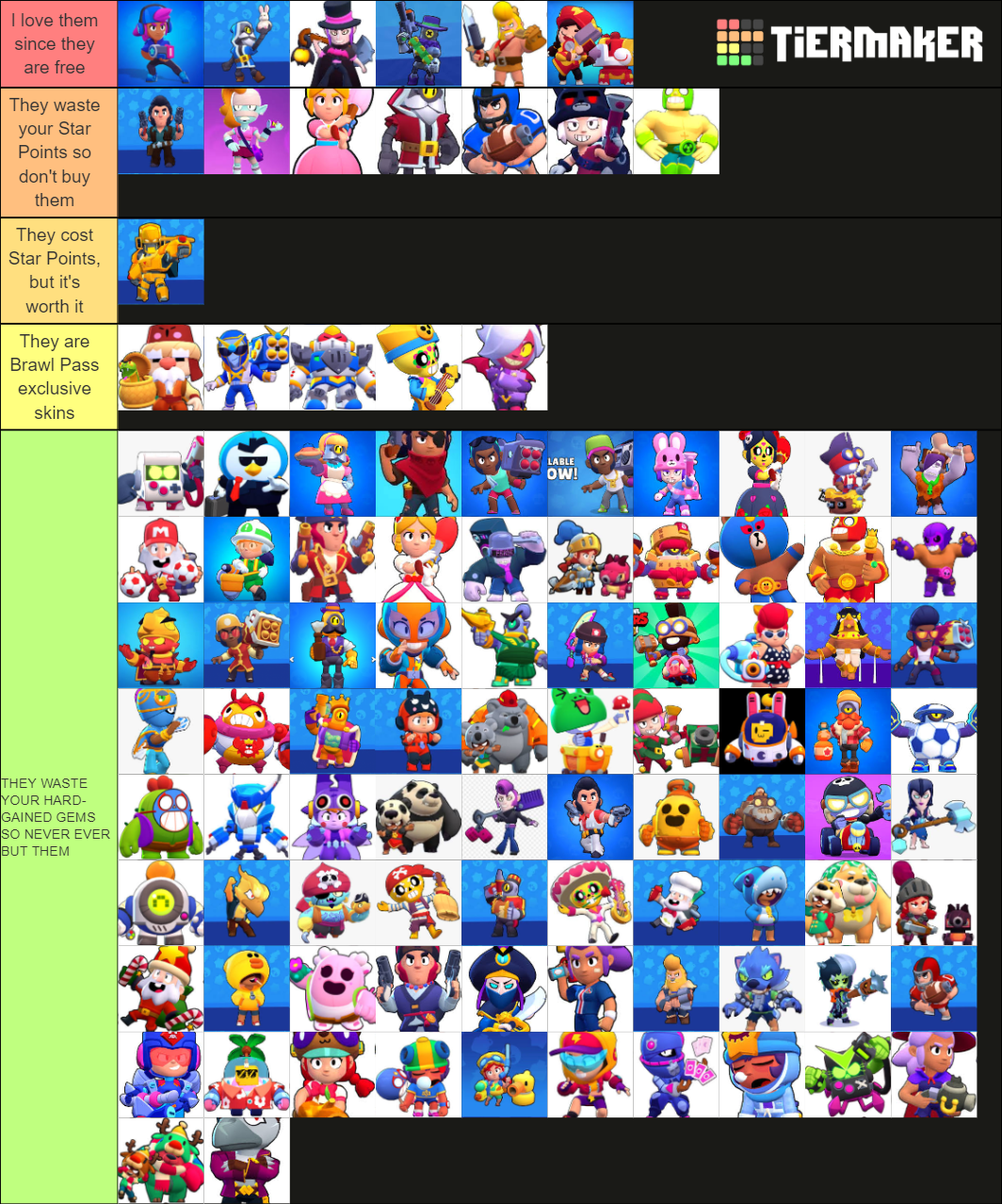 All available brawler skins in brawl stars. Well, by checking out our a tier list. Part 1 of my skin tier list in brawl stars! You can find the details of the recent update and associated balance changes here. Brawlers tier can help you to choose the right brawler to win event map easily.