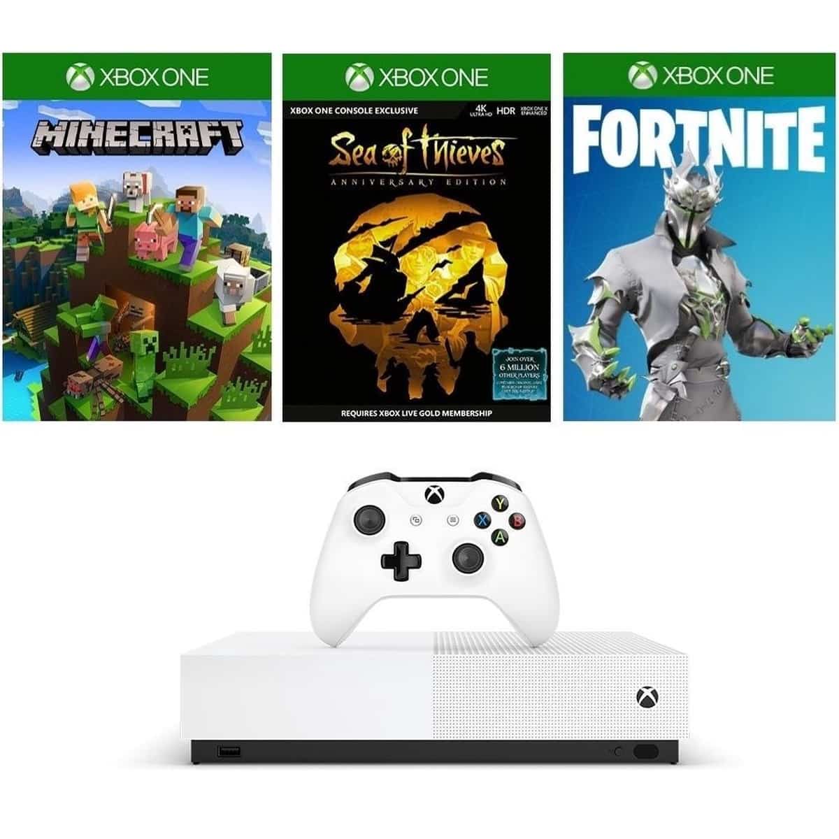 The bundle includes a trio of games: Fortnite came as download and works. Answer yes, xbox one games may be purchased through microsoft store or by purchasing a digital version through a retailer such as best buy. Answer you do not get to choose the three games it only comes with fortnite minecraft and sea of thieves the difference with this xbox and the $300 one is that this one is a all digital console that means there is no disk drive you can only buy games online or get the games that have a code you can redeem.oh yah and there no difference with. Thought i might be missing something but wondering if they just didn't include them.
